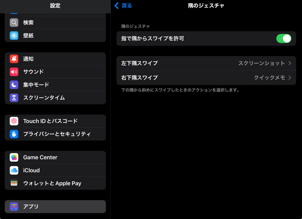 - 設定 → Apple Pencil →左下隅:スクリーンショット 右下隅:クイックメモ