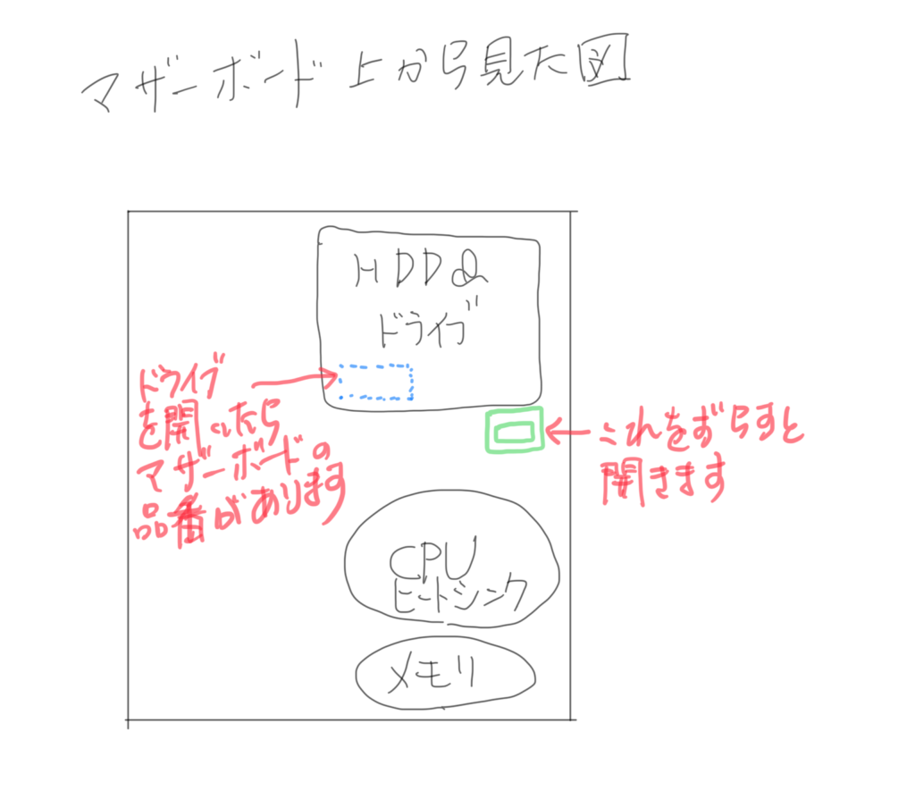 まずケースを開けます。ドライブトレイを持ち上げると、バーコードシールとともにマザーボードの品番を確認することができます。